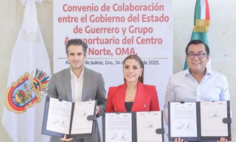 La gobernadora de Guerrero, Evelyn Salgado Pineda, firmó un convenio de colaboración con el director general del Grupo Aeroportuario del Centro Norte (OMA), Ricardo Dueñas Espriú, con el objetivo de modernizar y ampliar la operación de los aeropuertos de Acapulco y Zihuatanejo.