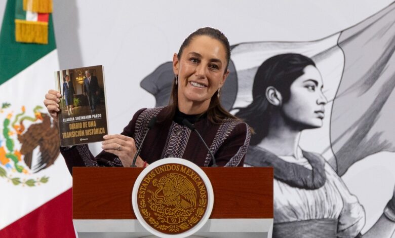 “Este fin de semana ya van a poder encontrar Diario de una transición histórica en las librerías”, informó Sheinbaum Pardo durante su conferencia de prensa.