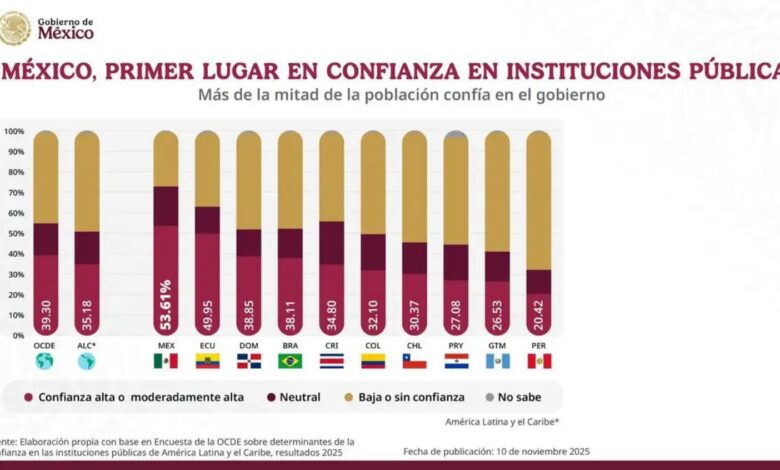 La presidenta de México, Claudia Sheinbaum Pardo, destacó que el país ocupa el primer lugar en América Latina en cuanto a confianza en las instituciones públicas, según los resultados de una encuesta reciente de la Organización para la Cooperación y el Desarrollo Económicos (OCDE).
