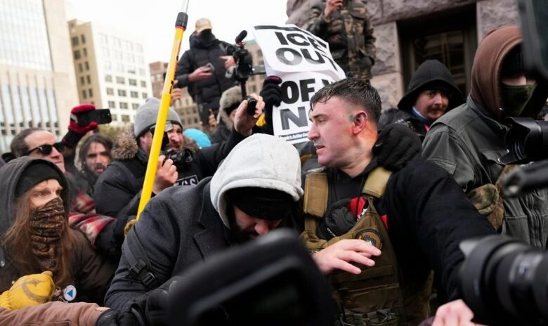 Jake Lang, organizador de la manifestación a favor de ICE, abandonó el lugar con aparentes heridas, incluyendo moretones y rasguños en la cabeza. Además, se registraron lanzamientos de bolas de nieve y globos de agua antes de que la policía de Minneapolis, fuertemente equipada, llegara acompañada de una furgoneta blindada.