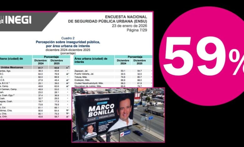 • La percepción de inseguridad pública creció de 45.6 a 58.7%, de diciembre de 2024 a diciembre de 2025, de acuerdo con los resultados del ENSU.